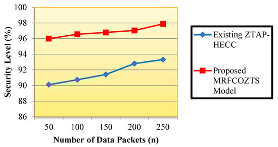 Table 8 and Figure 3 demonstrate the simulation results of security level based on data confidentiality in a satellite environment using the developed MRFCO-ZTS approach and state-of-the-art ZTAP-HECC []. During the simulation process, varying numbers of data packets in the range of 50 to 250 are considered as input. As exposed in the above tabulation and graphical comparative analysis, the developed MRFCO-ZTS approach achieved a higher security level for data communication in the satellite environment via continuously authenticating all the users at each session. In addition, the developed MRFCO-ZTS approach provides better security performance while increasing the number of input data packets thereto be transmitted over satellite networks when compared to conventional ZTAP-HECC []. This is because the process of MRFCO and ZTS in our work advances state-of-the-art works by balancing computational cost, security, and data integrity. The MRFCO-ZTS approach continuously observes user activity, such as keyboard input patterns, device behavior, and network activity, to notice any deviations from the established baseline. From this, the MRFCO-ZTS model greatly prevents unauthorized access via classification. Hence, the developed MRFCO-ZTS approach’s ratio of the number of data packets that are accessed only by authentic users in a satellite environment improves. As a consequence, the developed MRFCO-ZTS approach obtains a 97.88% security level while considering 250 users as input, whereas the conventional ZTAP-HECC [] obtained 93.32%.