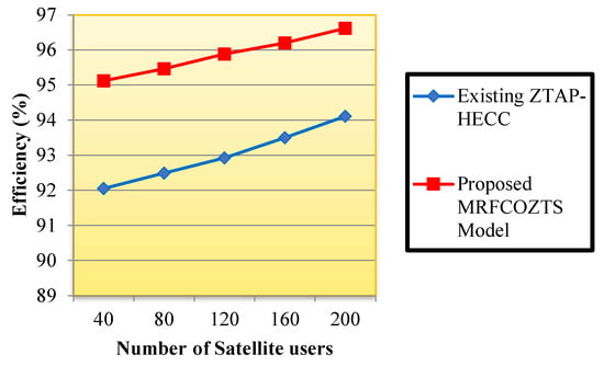 Table 10 and Figure 5 present testing results of authentication efficiency for different numbers of input satellite users using the developed MRFCO-ZTS approach and conventional ZTAP-HECC []. During the implementation, various numbers of satellite users in the range of 40 to 200 are used as an input to examine the performance of the proposed work for continuous authentication. As illustrated in the above tabulation and graphical representation, the developed MRFCO-ZTS approach achieves a higher authentication efficiency during satellite communication tasks. Also, the developed MRFCO-ZTS approach provides better authentication accuracy while assuming a larger number of satellite users when compared to existing ZTAP-HECC []. This is due to the usage of MRFO and ZTS in our developed MRFCO-ZTS approach, contrary to existing research works. The MRFCO-ZTS model considers the cost function of satellite users for continuous authentication. Therefore, the developed MRFCO-ZTS approach increases the ratio of the number of satellite users rightly authenticated as attackers or detectors in satellite networks. Accordingly, the developed MRFCO-ZTS approach achieves a 96.62% authentication efficiency while taking 250 satellite users as input, whereas existing ZTAP-HECC [] attained 94.11%.