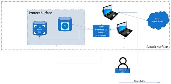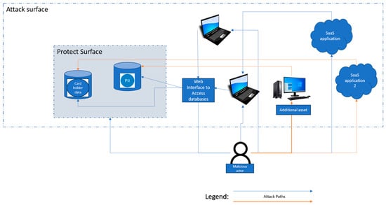 In Figure 1 we assume that the databases with Personally Identifiable Information (PII) and cardholder data are of value to the organisation, as any compromise of the data that persists in these databases (confidentiality-, integrity- and availability-wise) may lead to contractual, legal, regulatory and/or statutory impact. The organisation seeks to protect these two servers that are of prime importance from compromises. From a zero-trust perspective these two database servers form one protect surface. On the other hand, the attack surface consists of laptops, the Software-as-a-Service (SaaS) application and the web interface that connects to the database servers, as these assets provide attack paths for a malicious actor to reach the databases in the protect surface, which may result in compromise(s).