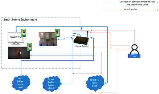 In Figure 3 the smart home environment consists of three disparate smart devices from three different vendors, each of which provides a specific functionality distinct from the others. These are smart home devices that connect with their home clouds via a home router to receive updates and upgrades and perhaps share telemetry. Most smart devices also have an interface application (web and/or mobile) that serves as an interface to configure the device. However, smart devices do not communicate amongst themselves. For example, a smart TV does not have any interface to connect with a smart fridge or a smart boiler. A smart fridge does not communicate with a smart boiler to change the heating settings. To compromise the smart devices, a malicious actor needs to (a) compromise the home router (vulnerabilities, open ports, etc.) or (b) conduct a person-in-the-middle attack between the home cloud and the smart device or (c) compromise the home cloud or (d) compromise the interface application. In effect, the attack surface for the smart home environment is formed of the home router, the communication layer between the smart device and the home cloud, the home cloud, and the interface application.