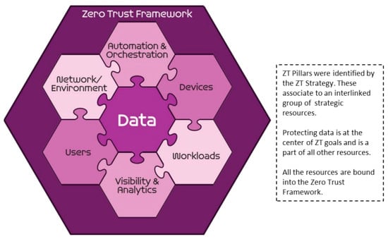 In 2021 the US Department of Defense (US DoD) cleared their zero-trust reference architecture for publication []. This architecture was used internally by the US DoD and cleared for public consumption. Though based on zero trust principles, the UD DoD created their architecture around what they term as pillars. Each pillar is a group of strategic resources and provides specific functions. The pillars are designed to protect the data pillar, as data was seen by the department as an equivalent of the protect surface to be secured. The architecture is thus data-centric, which is illustrated in Figure 6.