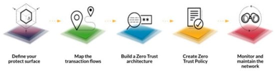 The zero trust five-step implementation process, as defined by the NSTAC report [], is illustrated in Figure 7.