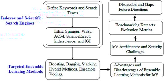 In this work, we used a comprehensive approach to collect and evaluate relevant data, ensuring a thorough understanding of the status of ensemble learning-based multi-class intrusion detection for IoV. Initially, pertinent keywords have been identified and searched to guarantee comprehensive coverage of ensemble learning techniques for IoV IDS. The search incorporated “Ensemble Learning,” “Intrusion Detection,” “Multi-Class Classification,” “Internet of Vehicles,” “VANETs,” and “Machine Learning.” To enhance search results and exclude irrelevant studies, Boolean operators such as “AND”, “OR”, and “NOT” were employed. The research included the following terms: “Ensemble Learning AND Intrusion Detection AND Internet of Vehicles,” “Multi-class classification AND Intrusion Detection AND VANETs,” “Machine Learning AND Intrusion Detection AND Vehicular Networks,” “Intrusion Detection Systems AND Ensemble Methods AND IoV”, as well as “Security AND Internet of Vehicles AND Machine Learning”.