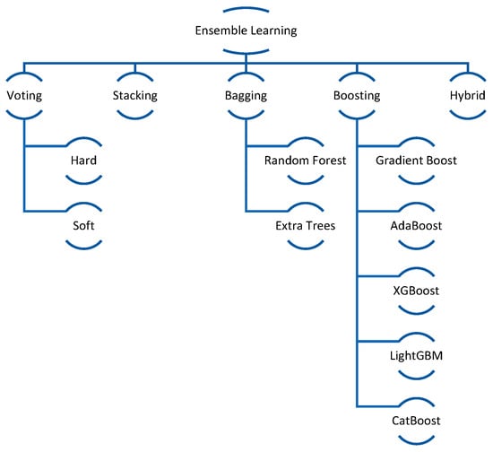 Dietterich [15] defined ensemble learning as an ML method whereby several models are combined to improve predicted accuracy. The ensemble learning working principle is to collect predictions through several models, which contribute to improving accuracy, especially in difficult tasks. Compared to single models, ensemble methods that combine the outputs of numerous base learners have the potential to attain more accuracy and robustness. As shown in Table 2, we classify ensemble learning into five categories: bagging, boosting, stacking, voting, and Hybrid. Indeed, sometimes combinations occur, resulting in hybrid ensemble approaches.