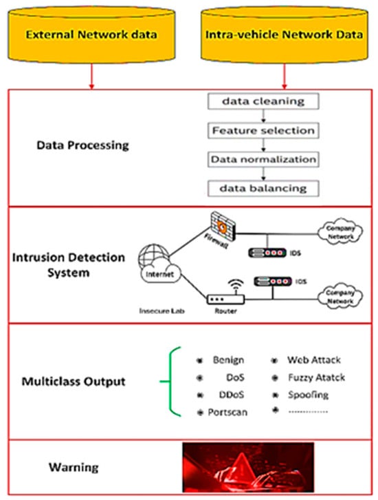 - Qin, J.; Xun, Y.; Liu, J. CVMIDS: Cloud-Vehicle Collaborative Intrusion Detection System for Internet of Vehicles. IEEE Internet Things J. 2024, 11, 321–332. [Google Scholar] [CrossRef]