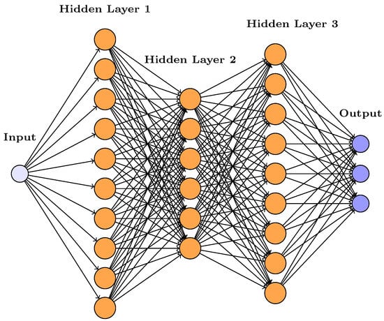 An example of a deep neural network with one input neuron, three output neurons, and three hidden layers, with 10.6 and 9 neurons.