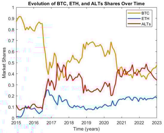 The market share of alternative cryptocurrencies (ALTs) is derived by subtracting the shares of Bitcoin (BTC) and Ethereum (ETH) from 1, ensuring that the total market share across all segments sums to unity.
