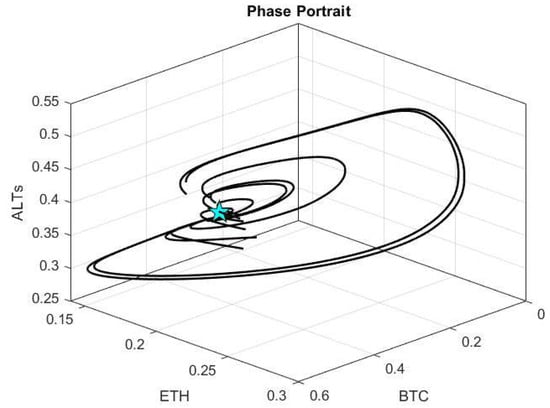 As we see in Algorithm 1, the neural network is trained to approximate the time evolution of the system by learning the mapping from time to the observed data []. After predicting the trajectories, we numerically compute the derivatives and fit them to a generalized Lotka–Volterra (GLV) model using nonlinear least squares optimization. The system of ODEs used to model the interactions among the three components (e.g., BTC, ETH, and ALTs) is given as follows: