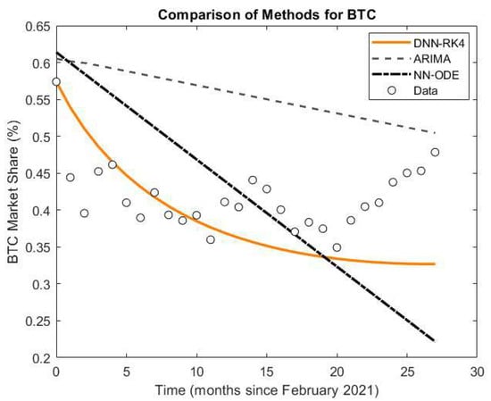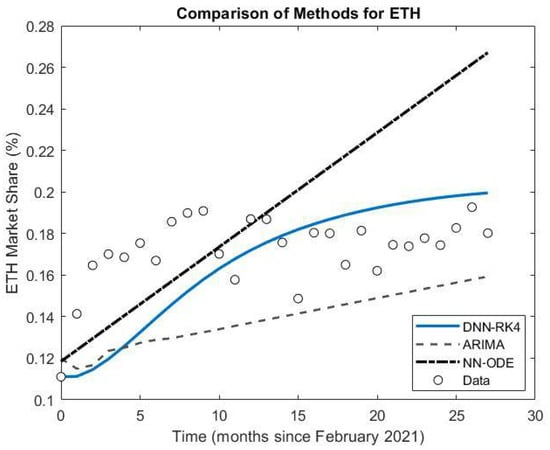 This analysis provides strong evidence that the DNN-RK4 method offers superior predictive power for modeling the evolution of cryptocurrency market shares when compared to traditional ARIMA time series approaches and the neural ODE method.