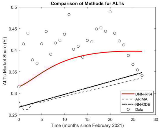 The DNN-RK4 model, driven by parameters estimated through a neural network, exhibited superior predictive performance across all market segments. For BTC, the DNN-RK4 model achieved an RMSE of 0.06865, significantly outperforming the ARIMA model’s RMSE of 0.14742 and the NN-ODE’s RMSE of 0.11757, as we notice in Figure 4. In the case of ETH, we see on Figure 5 that the differential was similarly notable—0.02682 (DNN-RK4) compared to 0.03665 (ARIMA) and 0.04507 (NN-ODE). For the ALT category, the DNN-RK4 model again showed improved accuracy, reducing the error from 0.11890 (ARIMA) and 0.11305 (NN-ODE) to 0.05581 as shown in Figure 6. These results highlight the advantage of using a model based on competitive dynamics to capture nonlinear relationships inherent to the cryptocurrency ecosystem, where investor behavior, technological updates, and market sentiment evolve rapidly.