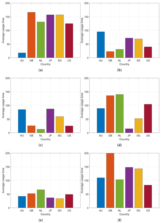 Verification of location-aware experiments: (a) AU time used for scanning target countries; (b) GB time used for scanning target countries; (c) NL time used for scanning target countries; (d) JP time used for scanning target countries; (e) SG time used for scanning target countries; (f) US time used for scanning target countries. Note: Horizontal axis indicates target country being scanned, and vertical axis is average time used to scan network segment.