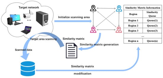 The method has two main objectives. One is to allow each scanning node to perform tasks according to its expertise based on its geographical location. The second is to ensure load balancing among the scanning nodes. As mentioned above, to achieve these two goals, we divide the method into two parts: clustering and grouping of scanner clusters and load balancing within and between clusters. In clustering and grouping of scanner nodes, the main factor is the geographical location of the scanners. However, due to the large number of countries in the world, we need to implement global IP address scanning at a limited number of scanning origin locations. Therefore, we need to introduce a similarity matrix () to quantify the scanning similarity between regions, where M is the number of geographic locations of scanners and N is the number of countries in the world. The similarity of each region in the initial similarity matrix can be derived from the time delay of the historical scan data. In order to solve the problem of inaccurate similarity due to long actual scanning delay, the similarity matrix is updated periodically based on the average value of the scanning results, and the process is shown in Figure 3. The similarity between each country () can be expressed by using the total number of IP addresses scanned from country i to country j () versus the total time required for country i to scan country j (). Specifically, see the following equation:
