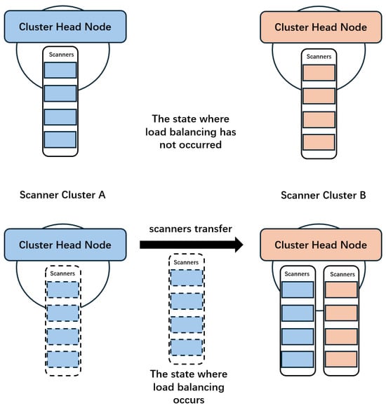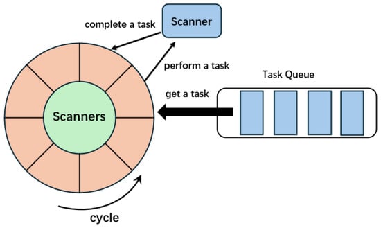 The second layer is collaborative scanning between scanner clusters, as shown in Figure 4. During task execution, some scanner clusters may have faster scanning speeds than others, leading to the possibility of idle clusters. When a scanner cluster is idle, it will check the workload status of other clusters in sequence according to the similarity matrix. If another cluster is busy, the scanning nodes of both clusters will merge to jointly execute the task. This process will be repeated whenever an idle cluster is found, until all clusters are in a busy state, thereby improving the scanning efficiency of the busy clusters. The third layer is load balancing among scanning nodes within a cluster, as shown in Figure 5. To achieve load balancing within a cluster, we construct a task queue that stores and distributes scanning tasks. If the task queue is not empty, scanning nodes within the cluster will sequentially fetch tasks from the queue. If the task queue is empty, the cluster will engage in the collaborative scanning process from the second layer. With this three-layer execution mechanism, each scanning node is assigned tasks with high similarity while ensuring that both scanner clusters and individual scanning nodes within a cluster achieve load balancing, ultimately increasing the overall scanning efficiency.