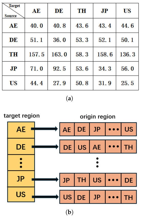 In our lab, we use global server resources deployed on AliCloud’s international platform covering multiple countries and regions, totalling over 500 lightweight servers, each of which can maintain direct communication with each other. These servers cover more than 50 countries with well-developed networks, such as the United States, China, the United Kingdom, France, Japan, and so on. Each country covers 5 major cities, with 2 servers in each city. Considering the variability of different geographical regions, we have chosen several countries with large geographical differences as the scanning origins of our experiments, namely TH, JP, DE, US, and AU. These countries not only are geographically dispersed but also have large variations in terms of network infrastructures, bandwidths, and latencies. As mentioned in the previous section, we mainly use Nmap as the main research tool, and hence Nmap is chosen as the scanning tool. In the algorithm, it is mentioned that we need to geolocate IP addresses; therefore, in the scanning dataset, we use IP2Location [19] as the IP geolocation database. In the execution part of the algorithm, it is divided into two parts in total; the first part is the pre-scanning procedure; therefore, we need to cluster the scanners of the five countries first and then select 30 network segments of each country from the IP2Location database as the initial task. In Figure 6a, we show part of the scanning data, with rows representing the target countries and columns representing the starting countries. Each value represents the average scanning time. In Figure 6b, we show the storage structure of the list. The lighter colours are the target geographic locations, and the darker colours are the geographic locations where the scanners are located. When there is a task to be assigned, the programme will first look for the lighter-coloured location and then sequentially look for the darker-coloured location to find a scanner that can be assigned.