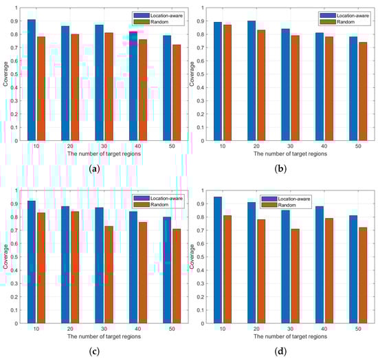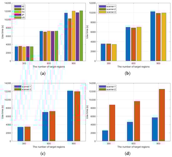 Impact of scanner clusters and number of target areas in coverage: (a) scan coverage of five scanner clusters; (b) scan coverage of ten scanner clusters; (c) scan coverage of twenty scanner clusters; (d) scan coverage of thirty scanner clusters. Note: All vertical axes indicate number of areas scanned, and all horizontal axes indicate coverage.