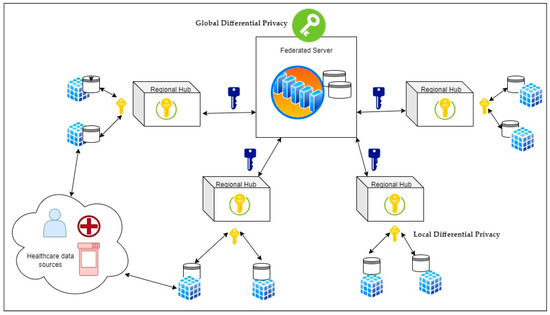 A federated learning architecture with Differential Privacy in the healthcare domain is shown in Figure 1. It describes healthcare data sources that are exchanging information amongst themselves and a central federated server connected to regional hubs. Local and Global Differential Privacy mechanisms are incorporated into the system to ensure the secure exchange of data on the network while protecting privacy.