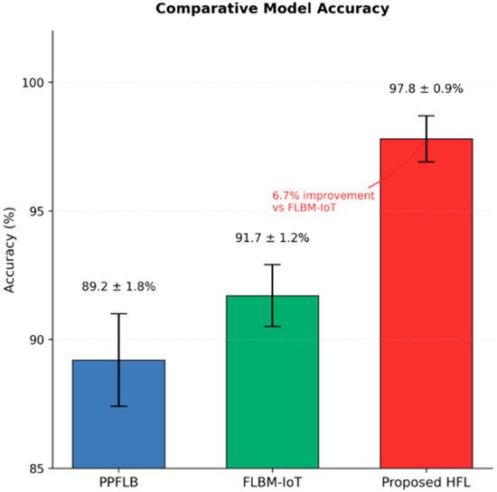 The model accuracy of the three different approaches is shown in Figure 3. The accuracy of the proposed HFL (Hierarchical Federated Learning) model, the highest accuracy, is more than 97.8%. It can be seen that the accuracy of the FLBM-IoT model is moderate at about 91.7%, while the accuracy for the PPFLB model is the lowest at about 89.2%. The superior accuracy of the HFL model highlights the effectiveness of the hierarchical structure in capturing diverse healthcare data patterns while maintaining the privacy of patient information. The training time and the communication overhead were measured as computational costs of the proposed HFL framework. The introduction of the regional aggregation hubs in the HFL model greatly decreased the data exchange traffic between the local nodes and the central server, which enabled the training cycles to be faster and more scalable.