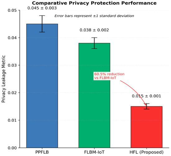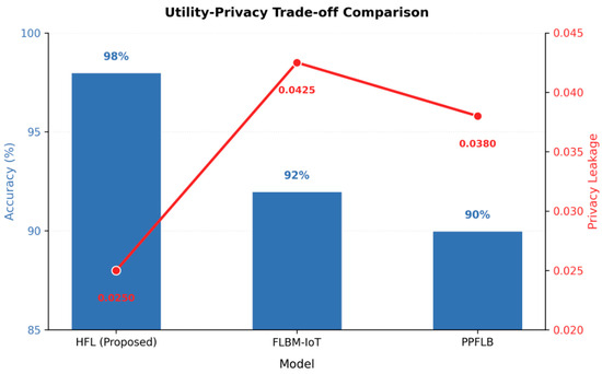 These results in Figure 5 show that the proposed HFL framework is very useful in minimizing the chances of privacy violation and therefore suits environments that require strong privacy, such as the healthcare domain, where patient privacy is very important. The utility of models and their privacy preservation are two conflicting factors that pose a common problem in federated learning. The proposed Hierarchical Federated Learning (HFL) framework solves this problem by utilizing a Novel Aggregated Gradient Perturbation Mechanism (AGPM). The dynamically adaptive noise addition mechanism controls how much noise is added in the process of updating the gradients so that the result is strong privacy protection with no significant loss of model performance. The success of such a privacy–utility trade-off was considered by considering the model accuracy and privacy leakage together. As illustrated in Figure 5, the proposed HFL model had a model utility score of 84% (compared to the baseline use of resources) and a high classification accuracy score of 97.8%, which is indicated by the green bar. At the same time, it had a very low privacy leakage, around 0.015 ± 0.001, as indicated in Figure 4. Comparatively, both the baseline models, FLBM-IoT and PPFLB, showed greater privacy leakages (0.038 and 0.045, respectively) and lower accuracies (91.7% and 89.2%, respectively).