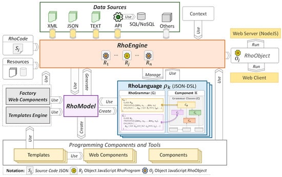 - Rho Programming Model (RhoModel): This model establishes a programming framework to add JavaScript functionality and support the corresponding code and documentation generation. RhoModel allows integrating (i) JSON-DSL specification, a programming language using JSON grammar, where RhoLanguage is a JSON-DSL combined with JavaScript classes to implement grammar elements (lower-central part of Figure 1). JavaScript components and web components [29,31] that interact with the JSON-DSL (bottom part of Figure 1). JavaScript template engines, like the Handlebars Engine, enabling the creation of custom templates efficiently (left-hand part of Figure 1). Definitions for connecting to various Data Sources such as JSON, XML, and text (top part of Figure 1).