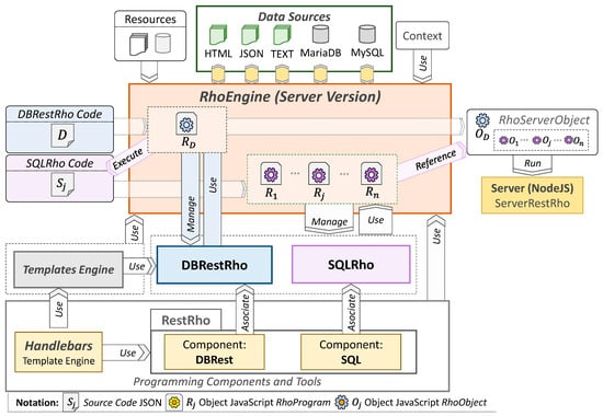 As previously stated, it is necessary to design, implement, and deploy a DSL to assess the RhoArchitecture, and this is where RestRho comes in. Particularly, RestRho is a JavaScript component that aims to define and dynamically deploy HTTP requests on a RESTful NodeJS server called ServerRestRho (Source code: https://www.devrho.com/restrho/js/RestRho2.js (accessed on 10 June 2025) (see Figure 2, right side).