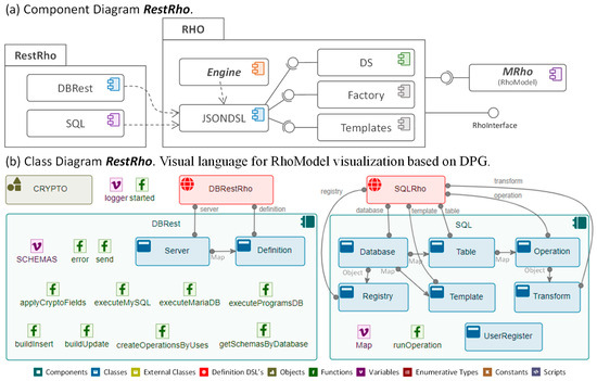 For its part, Figure 3b shows the RestRho class diagram. This diagram was created with Diagram Programming Generate DPG [34] and is a JSON-DSL that allows you to specify programmable diagrams based on PsiDiagram [35] for web applications. Detailed help on the RestRho class diagram is generated by WebIDERho and can be found at http://www.devrho.com?doc=restrho (accessed on 10 June 2025).