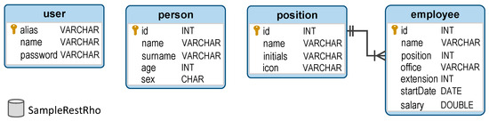 Figure 4 shows the Sample RestRho data model diagram. This model is implemented in MariaDB Server Community version 11.1.2-GA. The name of the database is SampleRestRho, and it is made up of four tables: user, person, position, and employee.