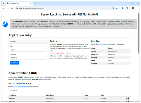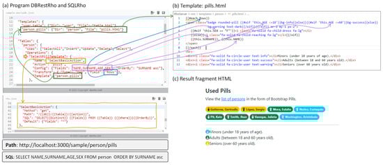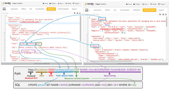 To achieve this, RestRho (Source code: https://www.devrho.com/restrho/js/ServerRestRho.js (accessed on 10 June 2025)) defines and deploys two RhoLanguages (see Figure 2, middle part), called SQLRho to define how to access and operate the databases and DBRestRho to define how to specify the HTTP requests and manage them by indicating the corresponding SQL template and associated SQLRho: