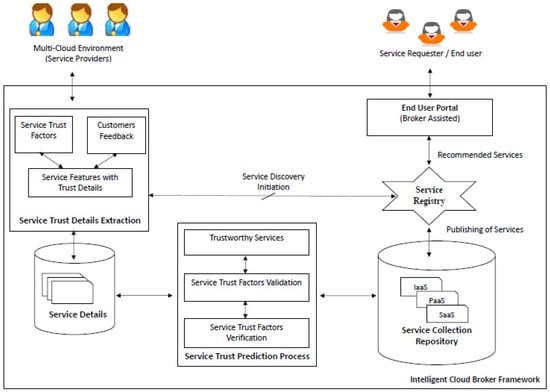 Identification of a right and valid cloud service is still a highly challenging problem, which leads to an untrusted service with massive time consumption. To overcome these issues, the proposed work aimed to validate the services by considering thirteen different potential trust metrics of the service such as response time, sustainability, suitability, accuracy, transparency, interoperability, availability, reliability, stability, cost, throughput, efficiency, and scalability. This section describes the proposed system with an overview which includes the relevant work modules for performing the validation and verification of cloud services in the multi-cloud environment. The overall architecture of the proposed work is shown in Figure 1. The primary objective of this work is attained by incorporating a special entity called ‘intelligent cloud broker (ICB)’, which is responsible for the overall processing of the proposed architecture.
