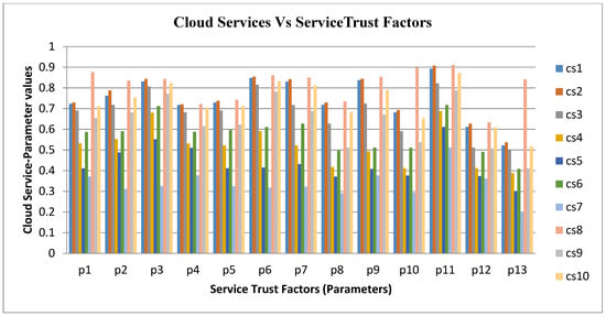 By considering Table 2, the service trust factors such as service response time, sustainability, suitability, accuracy, transparency, interoperability, availability, reliability, stability, cost, throughput, efficiency, and scalability are calculated to order the various cloud services. For each cloud service, the parameter values are measured for the SR values, which are shown in Figure 2.