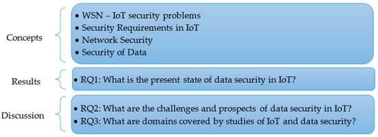The above-mentioned studies have highlighted the prominent WSN-IoT security attacks in recent years, based on criteria such as attack targets, technologies used, impact level, feasibility, and contribution to overall WSN-IoT security solutions. However, there are still gaps in these studies, especially in thoroughly analyzing attacks from a security perspective for WSNs while integrated with the IoT. Therefore, the corresponding security methods need to be comprehensively considered based on criteria such as cost optimization, resource efficiency, energy saving, and system availability assurance. In addition, other proposed solutions are also considered, including data aggregation methods, intrusion detection and trust modeling methods, and methods based on new technologies such as blockchain. Since there are many results related to security problems and solutions are considered separately in the fields, it is necessary to present some work that either leads to addressing the problems in some classifications or provides solutions corresponding to problems. The objective of this paper is to address these issues through the following research objectives and research questions (RQs), as shown in Figure 1.