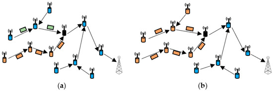 Network layer attacks: These attacks aim to focus on network protocols and infrastructure. Some of the common network layer attacks are the replay attack and the Sybil attack [43]. Other types of attacks include black hole attacks (Figure 5a) [44], gray hole attacks (Figure 5b) [45], wormhole attacks [46], sinkhole attacks [47], and hello flood attacks [48].