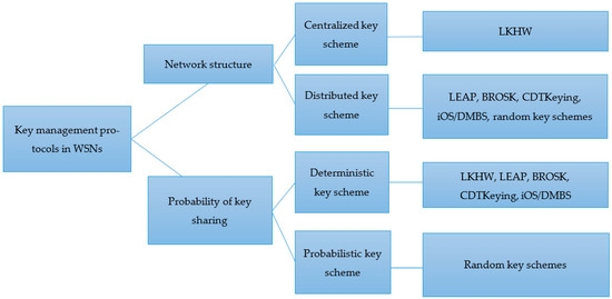 Key management includes establishing and maintaining keys (protection, distribution, use, destruction…) according to security policies (authenticity, confidentiality, integrity, scalability, and flexibility) and must ensure the resource constraints of the WSNs. The key management must also meet the handling requirements for malicious nodes (including resilience, revocation, and recovery). Key management protocols can be classified as shown in Figure 6.