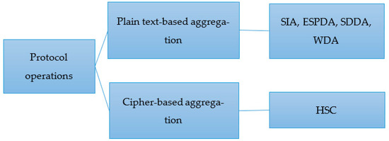 Data aggregation protocols aim to eliminate redundant data transmission over the networks. They are essential for energy-constrained WSNs. Traditional data aggregation techniques include simple query types such as SUM, COUNT, AVERAGE, and MIN/MAX [83]. Secure data aggregation requires authentication, confidentiality, and integrity. This also requires the cooperation of sensor nodes. Figure 7 shows the classification of secure data aggregation tools in WSNs. According to the operation of the protocol, it can be classified into two types: plain text-based and cryptographic-based.