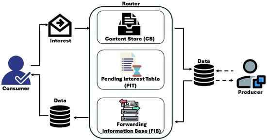 Named Data Networking (NDN) operates through a fundamentally different paradigm than traditional IP-based networks, using two core packet types to facilitate content-centric communication. As shown in Figure 1, interest packets serve as requests for named content, while data packets deliver the corresponding information back to requesters. The NDN architecture employs three critical data structures (see Figure 1) within each router to manage communication flows effectively. The Forwarding Information Base (FIB) maps content name prefixes to outbound interfaces, enabling routers to direct interest packets toward potential content sources. When content is available in a router’s Content Store (CS), which functions as a cache of previously retrieved data, the router immediately returns the requested information without forwarding the interest further. The Pending Interest Table (PIT) maintains state information for all forwarded interest packets that have not yet received the corresponding data packets, recording content names along with incoming and outgoing interface details to ensure proper routing of the data packet back to the requesters [,].