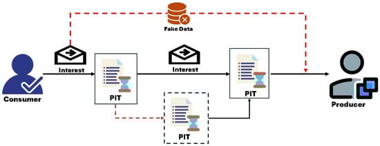 In a Fake Interest Attack (FIA), attackers generate interest packets requesting non-existent or intentionally invalid content. These interests are designed to have no corresponding data packets, causing them to remain unresolved in the PIT of NDN routers until they time out. The accumulation of such unsatisfiable interests can exhaust PIT resources, leading to network congestion and denial of service for legitimate users []. The FIA attack exploits the stateful nature of NDN’s forwarding plane, where each interest packet consumes memory resources until satisfied or expired. Mitigation strategies involve monitoring interest patterns to detect anomalies and implementing rate-limiting mechanisms to prevent PIT overflow. However, distinguishing between legitimate and malicious interests remains a significant challenge [,].