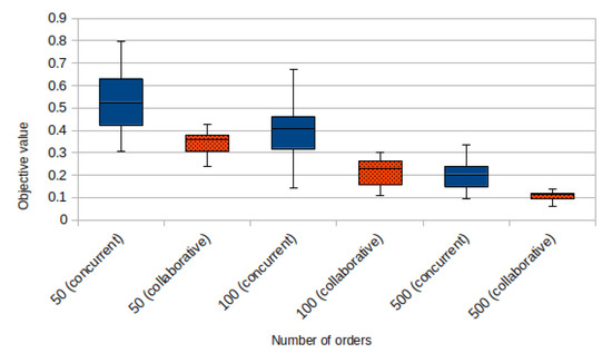 An important observation is revealed by a closer look at the figure. Namely, collaboration pays off more for instances with fewer orders, an aspect that is also reflected in the diminishing differences in the collaborative and concurrent objective values as the number of orders increases. This is not surprising, since higher numbers of orders per haulier already allow for reasonably efficient in-house optimization.