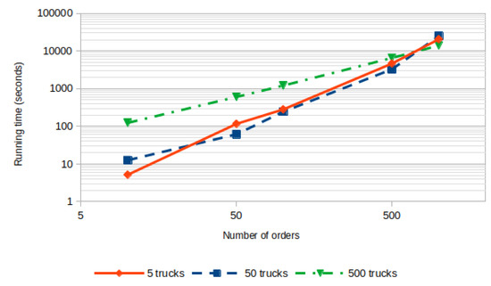 The solution was executed on a virtual machine equipped with a single-core CPU at 2.8 GHz, and with 16GiB of RAM, running Ubuntu 24.04 and Python 3.10. The results of the experiment are reported in Figure 2. There, a log-log plot was chosen because both axes span multiple orders of magnitude, and smaller values would otherwise be difficult to distinguish on a linear scale. For each choice of number of orders and of trucks, 10 experiments were run, and we report the median running time, although we remark that the variation was very small, with a standard deviation of less than 2% of the mean figures (and almost always less than 1%).