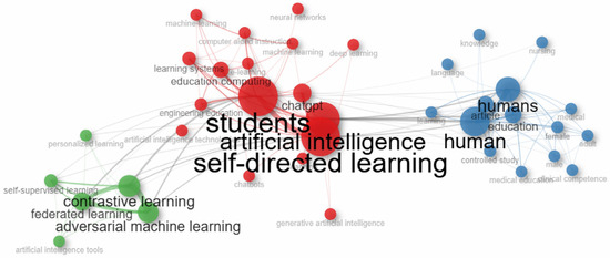 In Figure 3, red dots refer to technical and pedagogical terms such as machine learning, deep learning, engineering education, and chatbots, which reflect approaches from computer and educational sciences; blue dots indicate concepts related to human aspects such as human, humans, medical education, nursing, and questionnaires, suggesting studies focused on clinical or social contexts; green is used for emerging terms like federated learning, self-supervised learning, and contrastive learning, which represent advanced technological trends. This structure evidences the multidisciplinarity of the field, with a strong link between emerging technologies, educational methodologies, and human aspects, highlighting the centrality of AI in the process of autonomous learning.