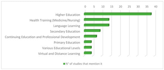 To a lesser extent, but still present, are contexts in primary education [15,49,67], various educational levels, and virtual and distance learning [19,31,56], suggesting that, although there is interest in these areas, the integration of AI for self-directed learning is still in its early stages or faces greater technical and pedagogical challenges.