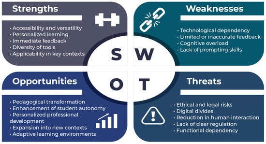 As evidenced in the results, both benefits and challenges are associated with the use of artificial intelligence in self-directed learning. To synthesize and present this information clearly, Figure 5 introduces a SWOT matrix (strengths, weaknesses, opportunities, and threats), which systematically summarizes the key findings of the study. This framework offers a comprehensive overview of the positive contributions of AI—such as learning personalization, real-time feedback, and applicability across diverse educational contexts—while also highlighting its limitations and potential risks, including technological dependency, ethical and legal concerns, and the reduction of meaningful human interaction. The matrix provides a strategic perspective that may inform future research, pedagogical design, and policy development aimed at the responsible and effective integration of AI in self-directed learning environments.