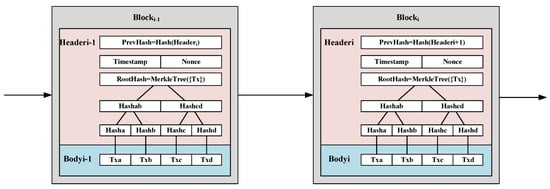 Existing SDN DDoS defense technologies have inherent limitations, highlighting the urgent need for new methods to combat DDoS attacks. With the development of new technologies, the widespread application of blockchain technology offers new perspectives for inter-domain collaboration in SDN network topologies []. Blockchain technology [], which integrates a series of existing technologies such as cryptography, Merkle trees, and consensus mechanisms, provides a robust foundation for collaborative defense against DDoS attacks due to its decentralization, data security protection, data sharing capabilities, and distributed nature []. Its basic principle is as shown in Figure 1. As shown in the figure, a blockchain is composed of a series of linked blocks, each consisting of a block header and a block body. The block header includes the hash of the previous block, a timestamp, a nonce, and the Merkle root of the transactions. This structure ensures data integrity, traceability, and efficient verification of transactions through the Merkle tree. It enables the automated, distributed sharing of data, facilitating data sharing in trustless networks. Blockchain technology addresses the challenges of data sharing and trust issues among multiple domains []. Smart contracts [] are used to define “protocols executed by various parties”, converting agreements among contract participants into rules written in code. They are reusable, modular, and automatically executed scripts running on the blockchain. Blockchain can leverage smart contracts and its inherent consensus mechanisms to solve cross-domain information exchange challenges and has proven effective in providing decentralized collaboration in trustless network environments. Blockchain technologies, such as Bitcoin, Ethereum, and distributed ledgers, have demonstrated high levels of security and transparency across various fields, and their application in SDN networks for DDoS defense holds significant potential for development [].