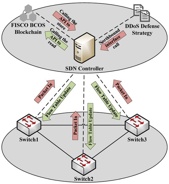 Our proposed strategy for mitigating DDoS attacks is divided into two main parts: (1) the processing of flow table data using blockchain technology, and (2) the DDoS detection strategy. The detection in the second part relies on the storage and processing of data information in the first part. Together, these components form the overall double-layered defense strategy. The structure is illustrated in Figure 2. Both the blockchain and detection algorithm are implemented at the northbound interface of the SDN controller. The SDN controller invokes them to transmit data packets to the switches in the data plane.