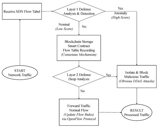 This section will provide a detailed overview of the proposed strategy for mitigating DDoS attacks, which is mainly divided into two parts: the handling of flow table data by blockchain and DDoS detection algorithms.Complete workflow of the dual-layer defense mechanism is illustrated in Figure 3.