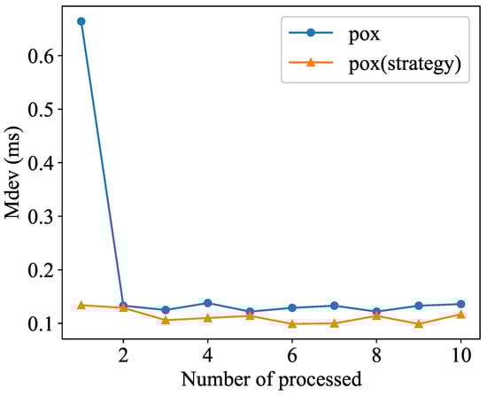Deployment Stability of the Strategy: Ensuring the stability of strategy deployment is crucial to prevent interference with the normal operation of the SDN network. We measure this stability using the mean deviation (mdev) of the round-trip time (RTT) of packets. A lower deviation indicates higher stability. The mdev value represents the average deviation of the packet round-trip times. This value is calculated by collecting RTT samples , computing their average, , determining the absolute deviation of each sample from the average, , and then computing the mean of all absolute deviations to obtain the mdev. The calculation formula for this metric is