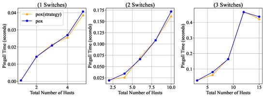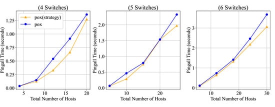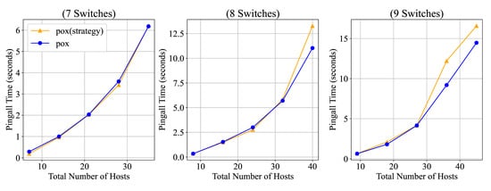 As illustrated in Figure 8, when the number of switches increases from 7 to 9, starting from 8 switches, the time required by our strategy-deployed controller to execute the ping_all operation begins to exceed that of the original POX controller.