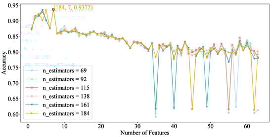 As shown in Figure 9, the X-axis represents the number of top features (i.e., the number of data features arranged in descending order of their correlation coefficients). When the number of trees is set to 184, and the top 7 features are selected, our strategy achieves optimal performance. Therefore, we choose this set of values as the parameters for our strategy model (the data in the figure only includes the portion of the chart containing the optimal data; in the actual data, the number of trees was incremented by a step size of 1, but due to the large scale of the data, a step size of 23 was used for plotting).