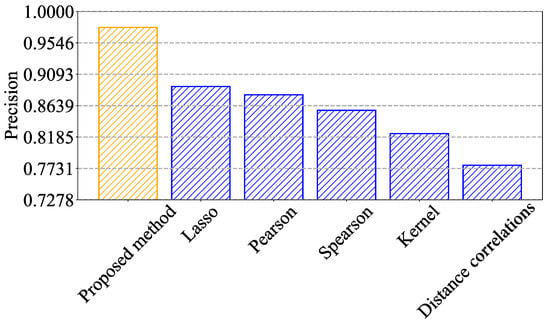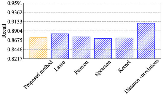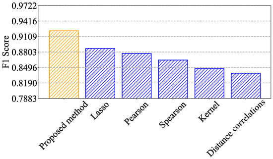 The F1 scores for each method are as shown in Figure 12: our proposed method achieves an F1 score of 0.922, while Lasso, Pearson, Spearman, Kernel, and Distance correlations achieve F1 scores of 0.886, 0.877, 0.865, 0.846, and 0.838, respectively. Our proposed method’s F1 score is the highest, indicating that it provides the best balance between precision and recall compared with the other methods.