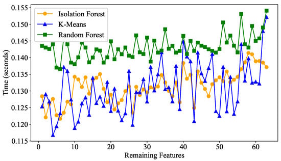 To ensure the fairness of the experimental results, we uniformly utilize the SDN network topology developed in this study and employ the CIC-DDoS2019 dataset as the data support for simulating real network traffic. During the data preprocessing phase, we apply our composite feature selection method to calculate the correlation coefficients of all data features. The dataset is then divided into training and testing sets, and the three strategies are trained and tested over multiple iterations. In each training round, the number of selected features is progressively reduced, starting with those having the lowest correlation coefficients. This approach minimizes potential discrepancies caused by the differing feature selection methods of the three strategies. Finally, we compare the time consumed by each strategy for determining the same test set after training with the same number of selected data features.