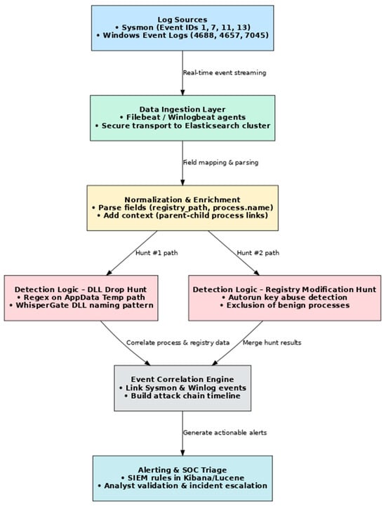 Figure 1 shows the detailed workflow diagram for the entire methodology of the proposed Elasticsearch-based SIEM threat hunting framework. It starts with log sources, including Sysmon event IDs and Windows Event Logs, collected from all monitored endpoints. These logs are processed through the data ingestion layer (Filebeat/Winlogbeat) into Elasticsearch, then normalized and enriched to organize fields and connect related process or registry data. The workflow then splits into two hypothesis-driven hunts—dll drop detection in AppData Temp directories and autorun registry key abuse detection. Finally, the event correlation engine combines hunt results to rebuild attack chains, producing actionable alerts for SOC triage and incident response.