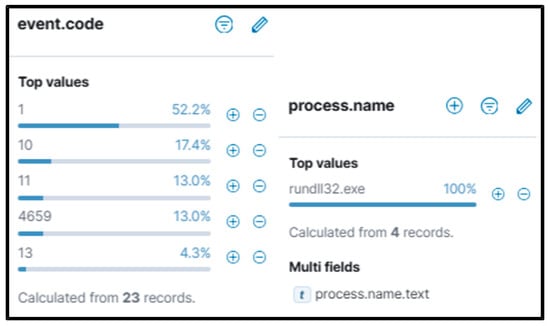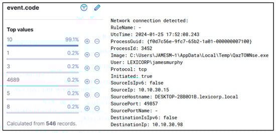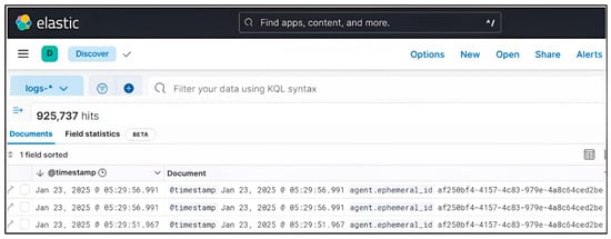 This research presents the SIEM built on the Elasticsearch platform, running on an Ubuntu OS. The implementation used Python and query languages like Kibana [] and Lucene [], ingesting a total of 925,737 log entries collected over a 30-day period from 25 Windows 10 Pro workstations and 3 Windows Server 2019 instances within an institutional Active Directory domain. This SIEM dashboard features a query menu to modify field names, searches, and filters to perform pivots by submitting domain-specific languages like KQL or Lucene queries, as illustrated in the accompanying Figure 2.